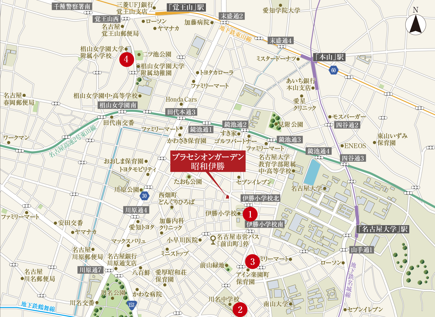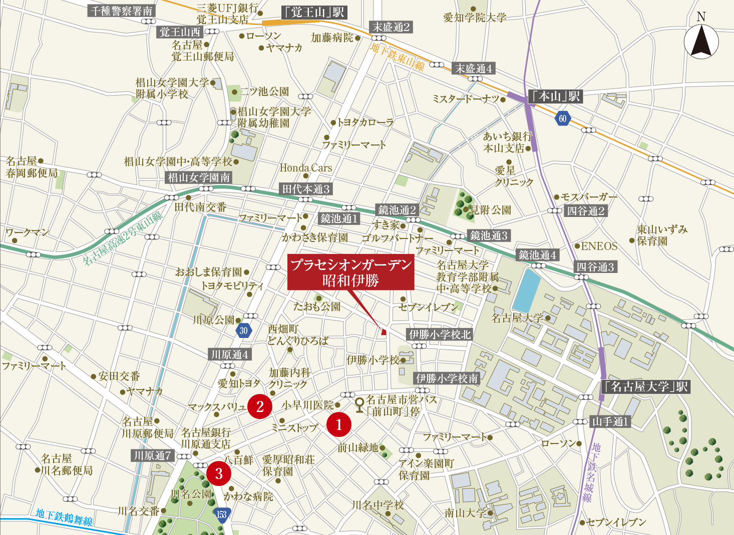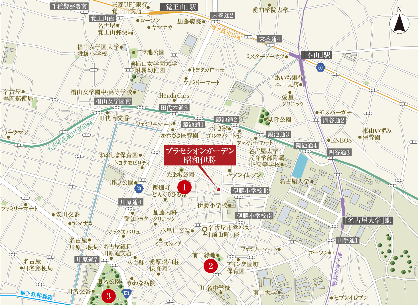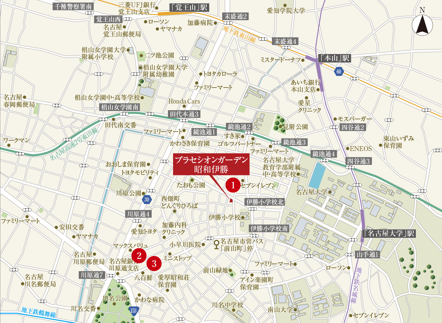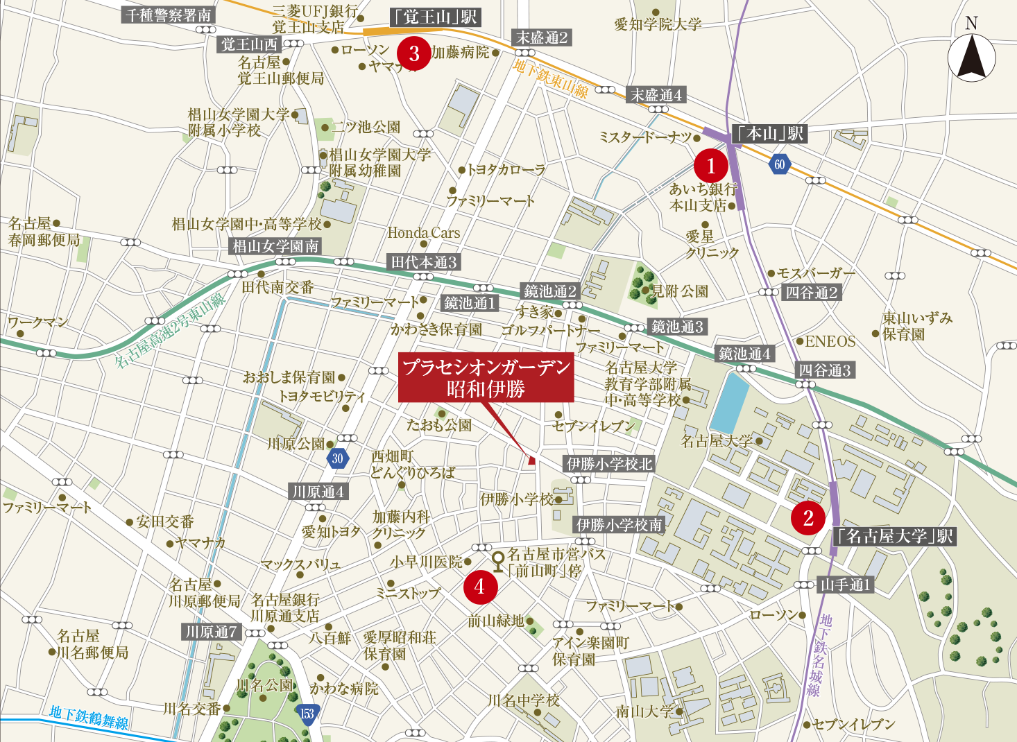 地下鉄東山線・名城線「本山」駅 (現地より約1,120m〜1,130m 徒歩14〜15分)