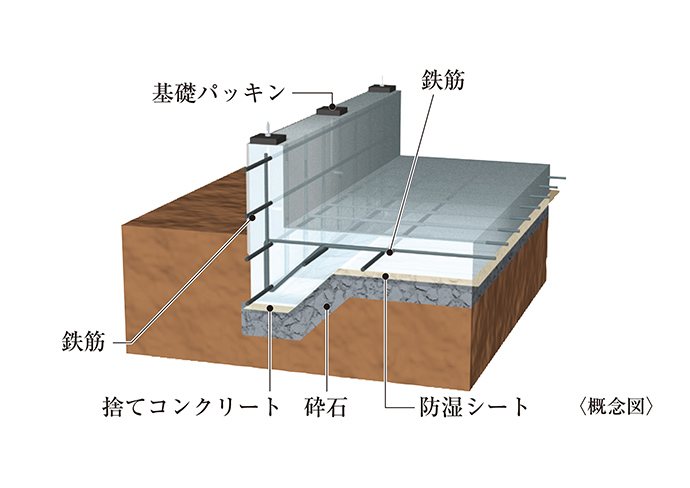 ベタ基礎とは建物の底板全面を鉄筋コンクリートにした基礎です。不同沈下の防止や防腐、防蟻、防湿に有効な基礎です。耐震等級3構造のため、構造計算により配筋間隔・立ち上がり基礎幅・地中梁等増強される部位があります。さらにベタ基礎下部には防湿シートを敷き詰め地中からの湿気を防ぎます。