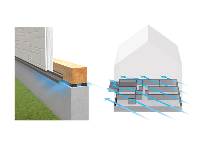 基礎パッキン工法によりの床下換気口の面積が広がり、床下にまんべんなく空気を送ることが可能で、湿気から土台、建物を守り、建物の耐久性を向上させます。また、基礎に換気口を設けないのでクラック(ひび)などの問題も回避できます。