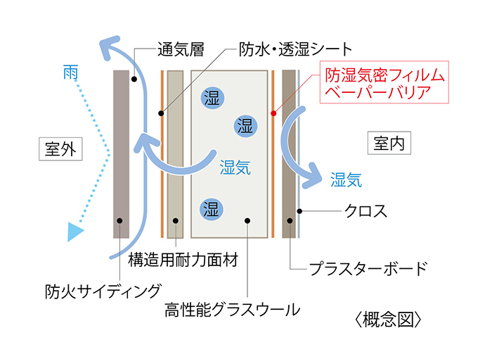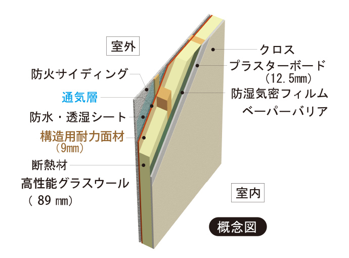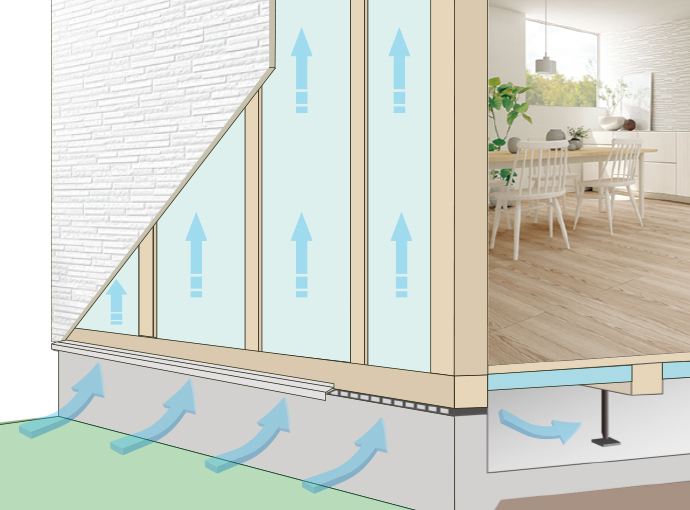 外壁材と構造躯体との間に外気が流れる層をつくり湿気を外部に放出する事により壁内結露を少なくし建物の耐久性を高めます。