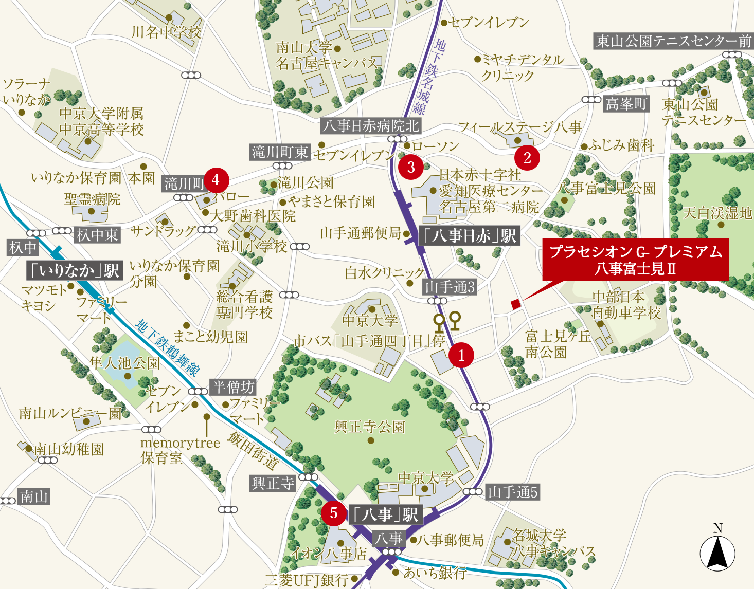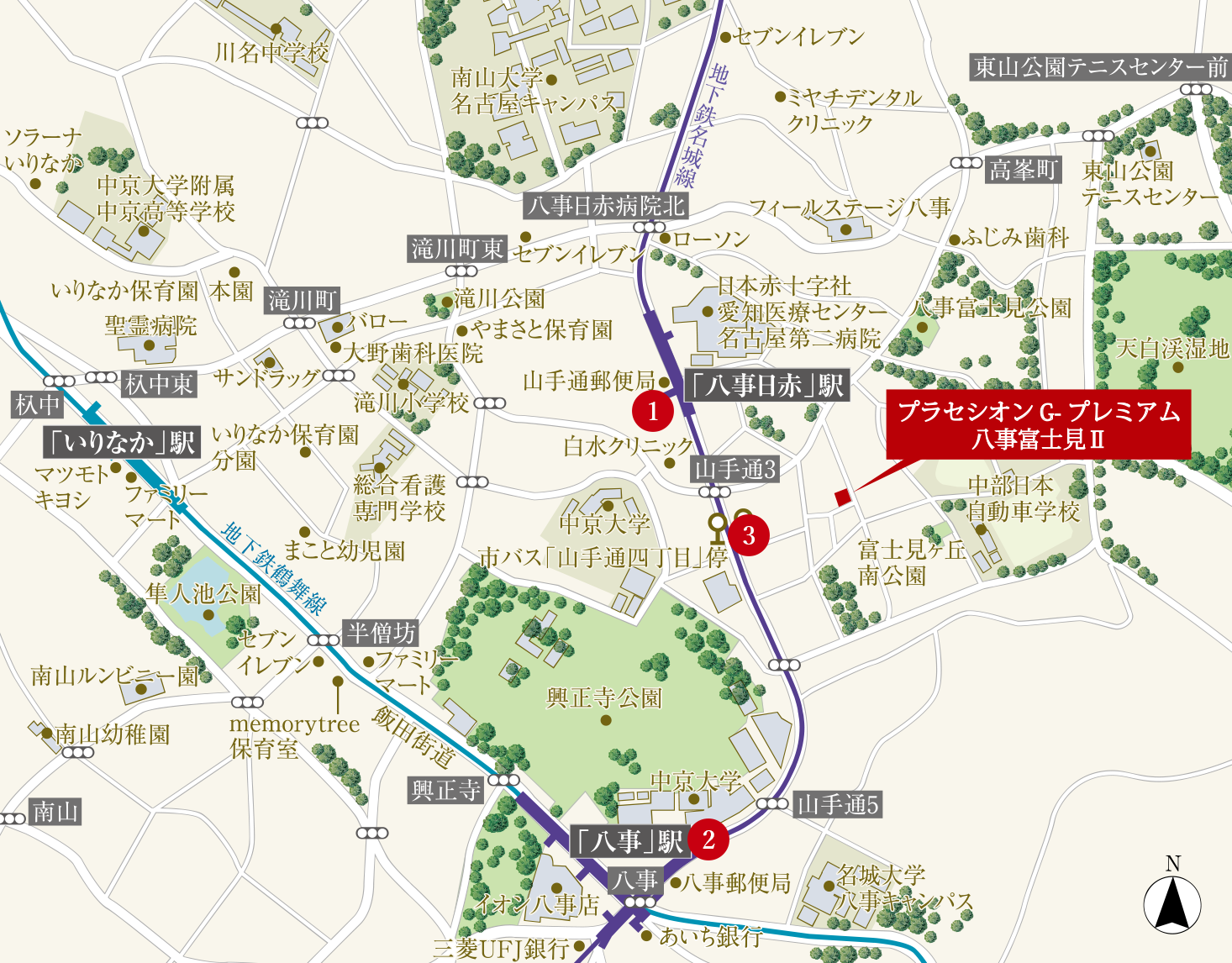 地下鉄鶴舞線・名城線「八事」駅 (現地より約730m〜740m 徒歩10分)